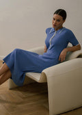 Designed for effortless sophistication, this polo-style knit dress features a structured collar, subtle button detailing, and a fluid midi-length silhouette that flatters the figure. Crafted with a soft, lightweight knit, it transitions seamlessly from casual to elevated settings.