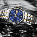 A refined timepiece that blends contemporary design with practical functionality, this stainless steel watch features a striking blue dial accented with diamond-effect markers. The faceted bezel catches the light with every movement, while the integrated day and date display offers everyday convenience. Finished with a durable link bracelet, it’s built for both style and longevity.