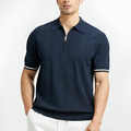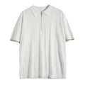 Men's Short-Sleeve Fine Knit Polo Tee - Spread Collar Quarter-Zip Placket - Vertical Ribbed Stripe Panel - Contrast Tipped Cuffs Smart Casual Style