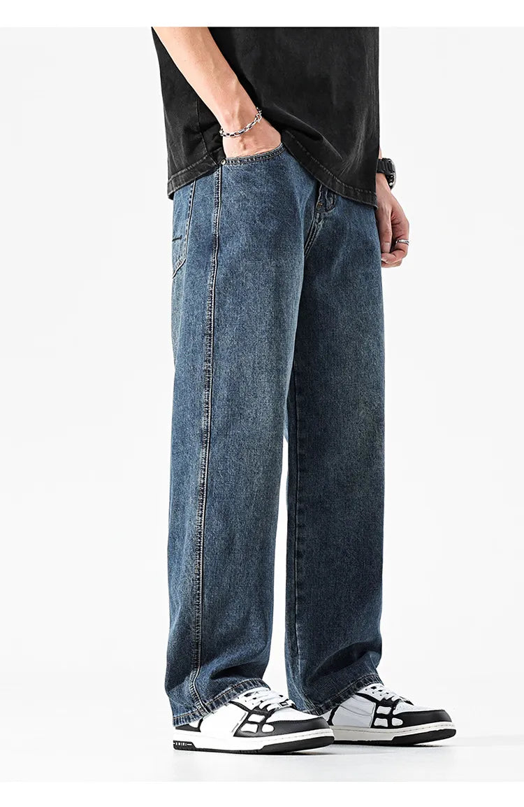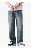 Men's Wide-Leg Straight Cut Denim Jeans - Zip Fly Button Waist Washed Finish Casual Style