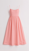 Design: A-line silhouette, spaghetti straps, flowing midi length