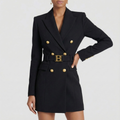 A refined silhouette that transitions seamlessly from day to evening, this double-breasted blazer dress embodies poise and polish. The satin lapel and covered buttons introduce a touch of understated luxury, while the tailored structure enhances a sharp, confident fit. Discreet flap details frame the waist, balancing elegance with modern edge. Versatile enough for both professional moments and evening occasions, it delivers a statement of effortless sophistication.