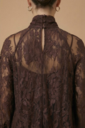 Designed to move with quiet drama, this flowing silhouette brings softness and confidence into perfect balance. The sheer lace detailing creates depth without excess, while the relaxed cut and elongated length deliver an effortless, graceful presence. Finished with a refined neck tie detail, it’s a striking choice for evenings and occasions where elegance should feel natural, not forced.