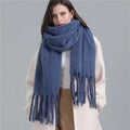 Design: Oversized winter scarf with long tassel fringe, soft-touch finish, generous length for multiple wraps