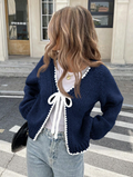 Playful yet polished, this cropped cardigan redefines casual chic. The open front ties into a neat bow, framed by contrast scalloped trim for a feminine finish. With its soft knit texture and relaxed silhouette, it’s the perfect layering piece for effortless daytime looks or elevated off-duty style.