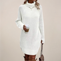 Cosy meets polished in this knit sweater dress. The soft turtleneck frames the face, while the relaxed raglan sleeves and rib trims create a flattering, easy drape. Knee-skimming with a stepped hem for movement, it pairs effortlessly with boots and a crossbody for brunch, errands or smart-casual evenings.