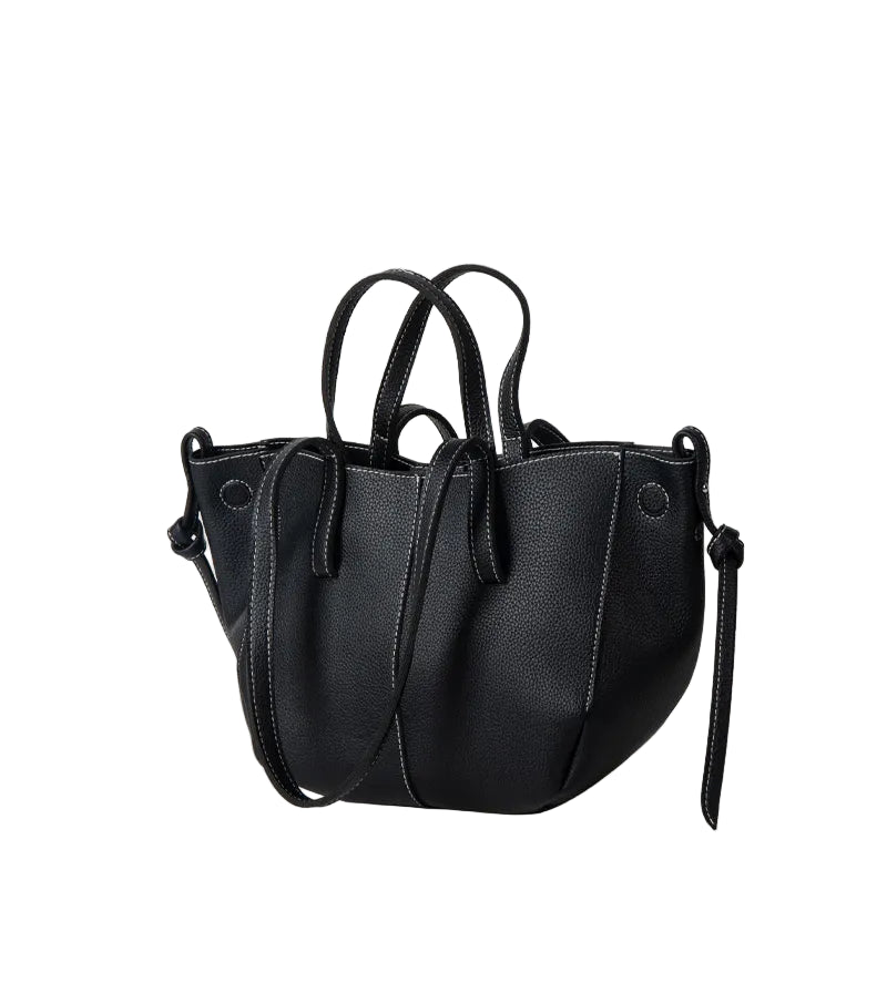 Design: Structured trapeze tote with pebbled finish, contrast stitching, dual top handles and longer shoulder straps, open-top silhouette