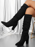 Women's Knee High Boots - Slouch Block Heel Pointed Toe Pull-On Style - Suede Finish