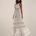 Gracefully effortless, this sleeveless maxi dress features an empire waist and deep V-neckline that flatters the figure while offering breezy comfort. Designed to flow from the bust, it creates a soft, elongated silhouette perfect for warm-weather days and bohemian-inspired moments. The airy shape and subtle detailing make it an ideal choice for daytime ease and evening elegance alike.