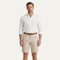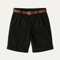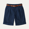 A tailored chino short with a double-pleat front, zip fly, belt loops, and a tan leather belt with a silver rectangular buckle included. Side slash pockets sit cleanly within the pleated front panel, the leg falls to just above the knee, and a deep turnup cuff finishes the hem with a considered, structured edge. No cargo pockets, no embellishment — a clean, dressed-up short with a relaxed straight cut through the thigh.
