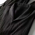 A coordinated two-piece set in a consistent crinkle-textured fabric across both pieces, giving the combination a unified, intentional finish. The short-sleeve top features a shawl-style v-neckline with a small button fastening at the collar, whilst the tapered ankle-length trousers are cut with an elasticated drawstring waist and a clean straight leg that narrows slightly toward the hem. Worn together or as separates, both pieces carry the same surface texture throughout, making the pairing effortless across casual and smart casual settings.