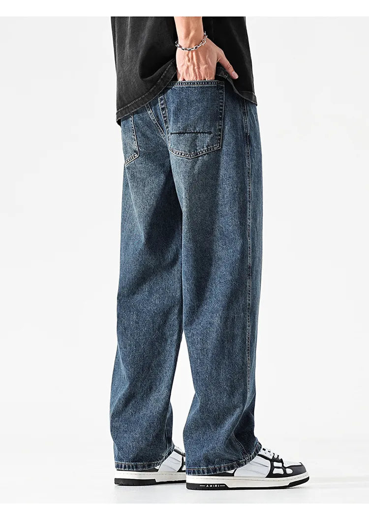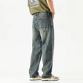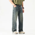 Men's Wide-Leg Straight Cut Denim Jeans - Zip Fly Button Waist Washed Finish Casual Style