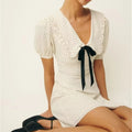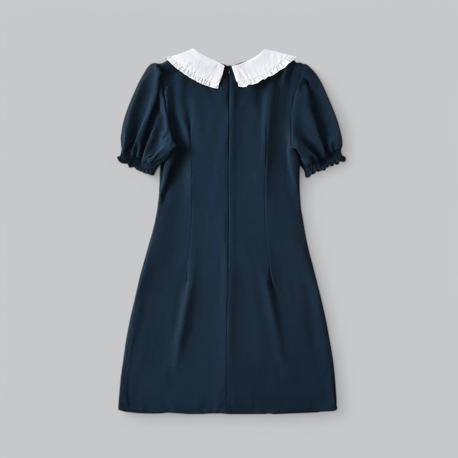 Timeless and effortlessly charming, this polka dot mini dress captures vintage elegance with a modern touch. Designed with a flattering empire waist, puff sleeves, and a classic Peter Pan collar, it creates a soft, feminine silhouette perfect for warm-weather days.