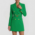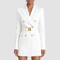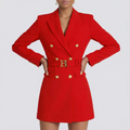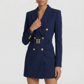 A refined silhouette that transitions seamlessly from day to evening, this double-breasted blazer dress embodies poise and polish. The satin lapel and covered buttons introduce a touch of understated luxury, while the tailored structure enhances a sharp, confident fit. Discreet flap details frame the waist, balancing elegance with modern edge. Versatile enough for both professional moments and evening occasions, it delivers a statement of effortless sophistication.