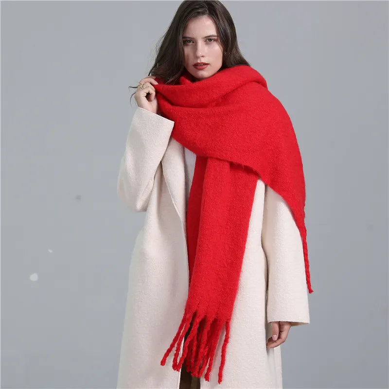 Design: Oversized winter scarf with long tassel fringe, soft-touch finish, generous length for multiple wraps