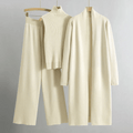 Effortlessly blending comfort with sophistication, this three-piece lounge set offers a refined take on relaxed dressing. Featuring a ribbed high-neck top, fluid wide-leg trousers, and a flowing longline cardigan, it creates a coordinated silhouette that moves with ease. Perfect for quiet weekends or elegant travel days, the minimalist design exudes understated luxury while maintaining an irresistibly soft and comfortable feel.