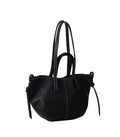 Design: Structured trapeze tote with pebbled finish, contrast stitching, dual top handles and longer shoulder straps, open-top silhouette