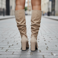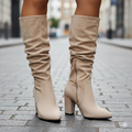 Women's Knee High Boots - Slouch Block Heel Pointed Toe Pull-On Style - Suede Finish
