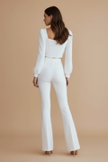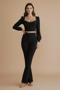 Women's Two Piece Set - Puff Sleeve Cropped Button-Front Top and High-Waist Flared Trousers - Going Out Style